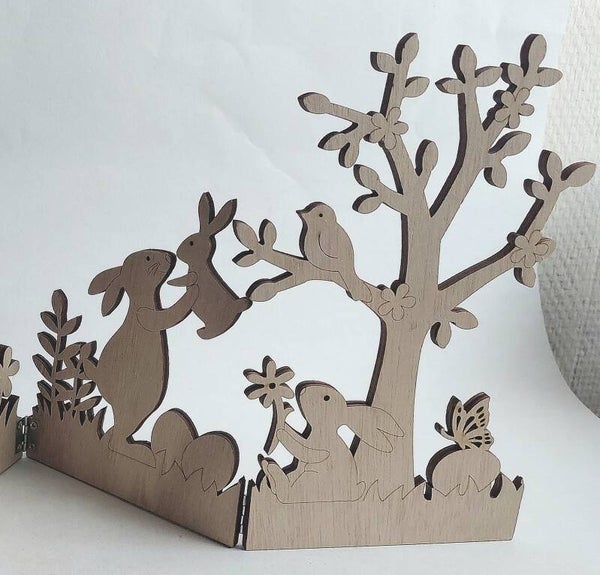 Houten tafereel met scharnieren zodat het in desgewenste vorm kan worden neergezet.